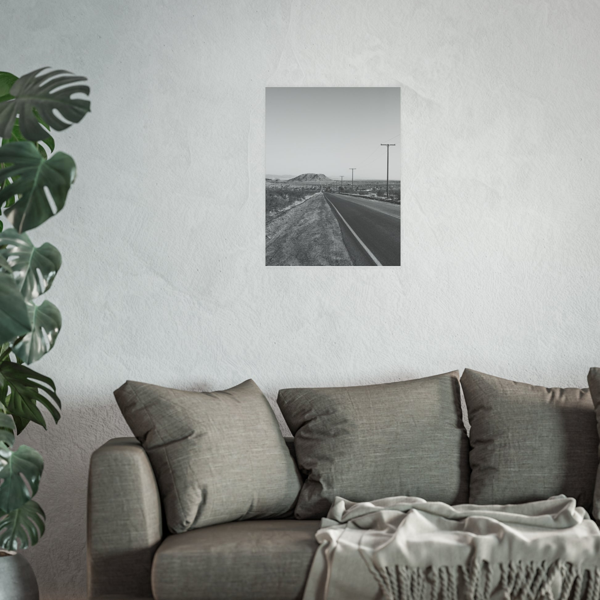This black and white photograph captures the quiet vastness of the open desert road, stretching endlessly toward a distant hill. Its stillness evokes solitude, freedom, and the timeless pull of the unknown.