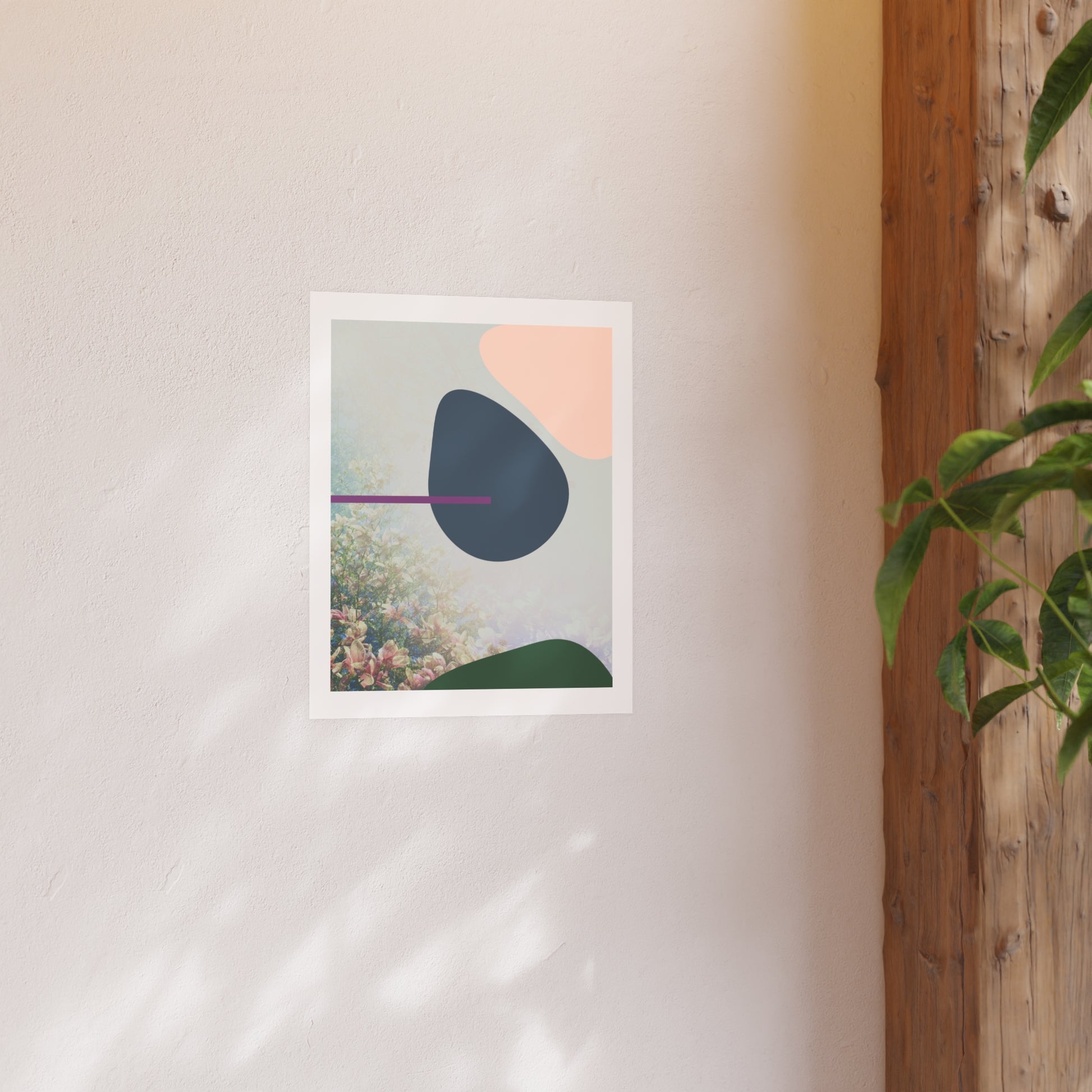 Titled Catch, this photograph merges the elegance of blooming magnolias with abstract form to create a serene, layered composition. Taken in Brooklyn, NY, the image captures the soft bloom of spring beneath gently diffused light, while bold, organic shapes in navy, blush, and forest green hover above.