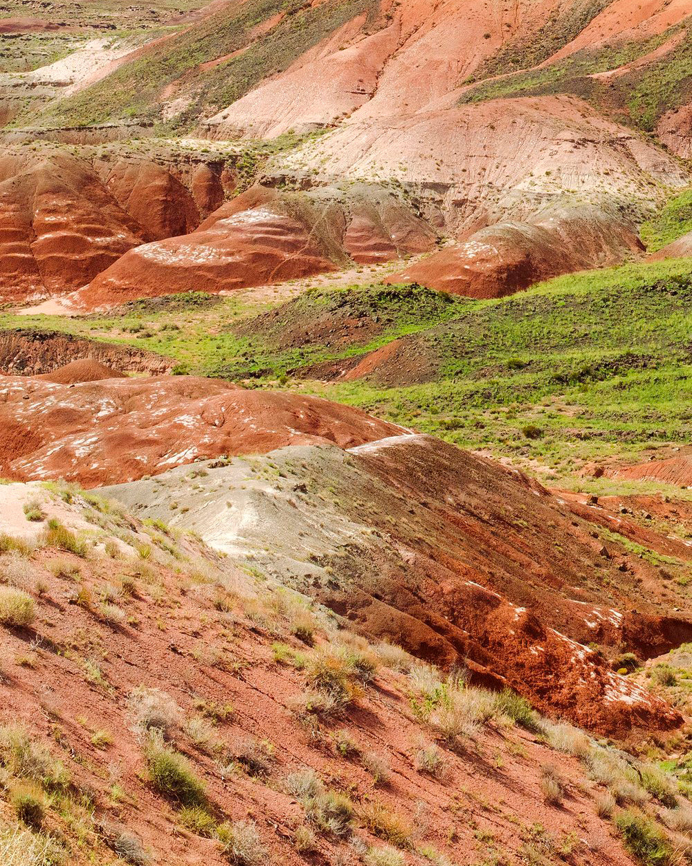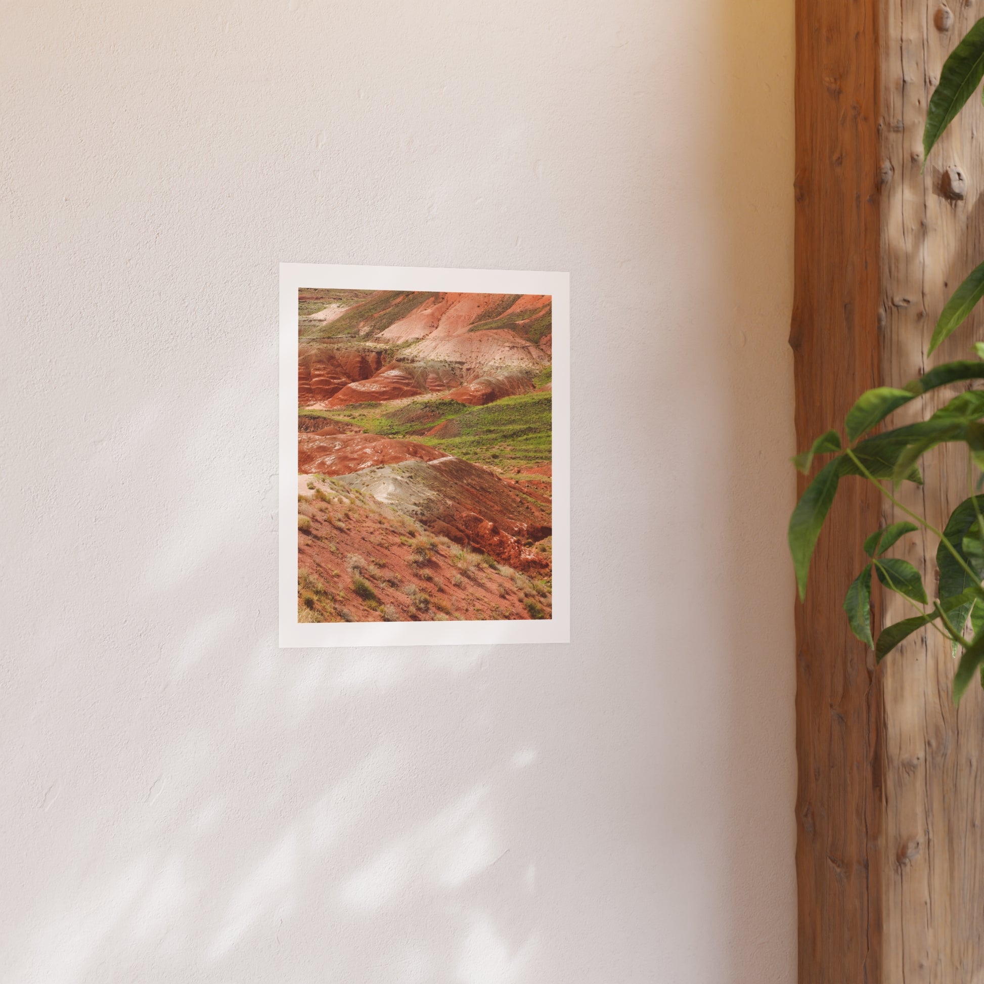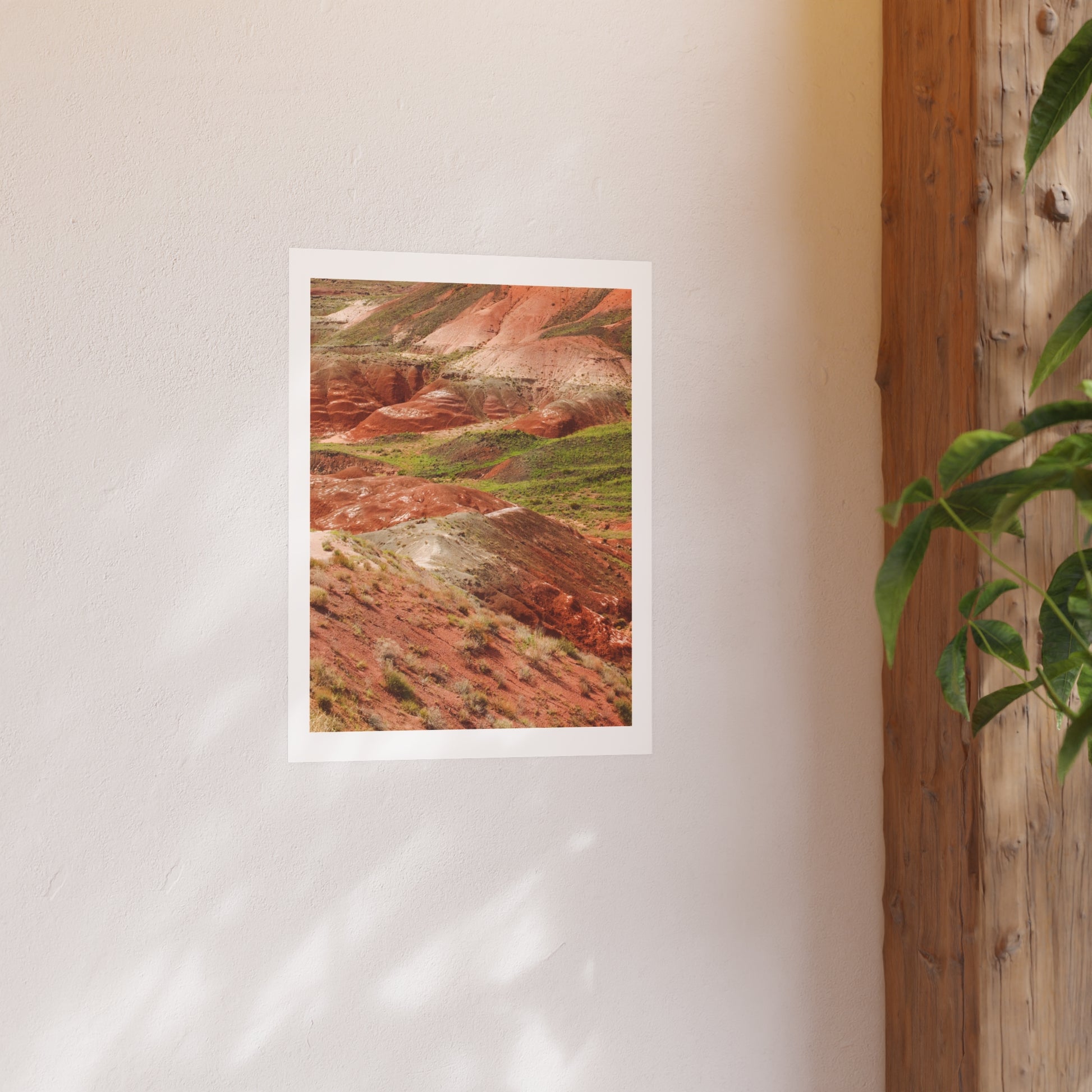 This abstract photograph is a testament to the awe-inspiring rugged landscape of the Petrified Forest National Park. The interplay of rich red, green, and earthy tones creates a tapestry of color that evokes the natural artistry of the terrain.