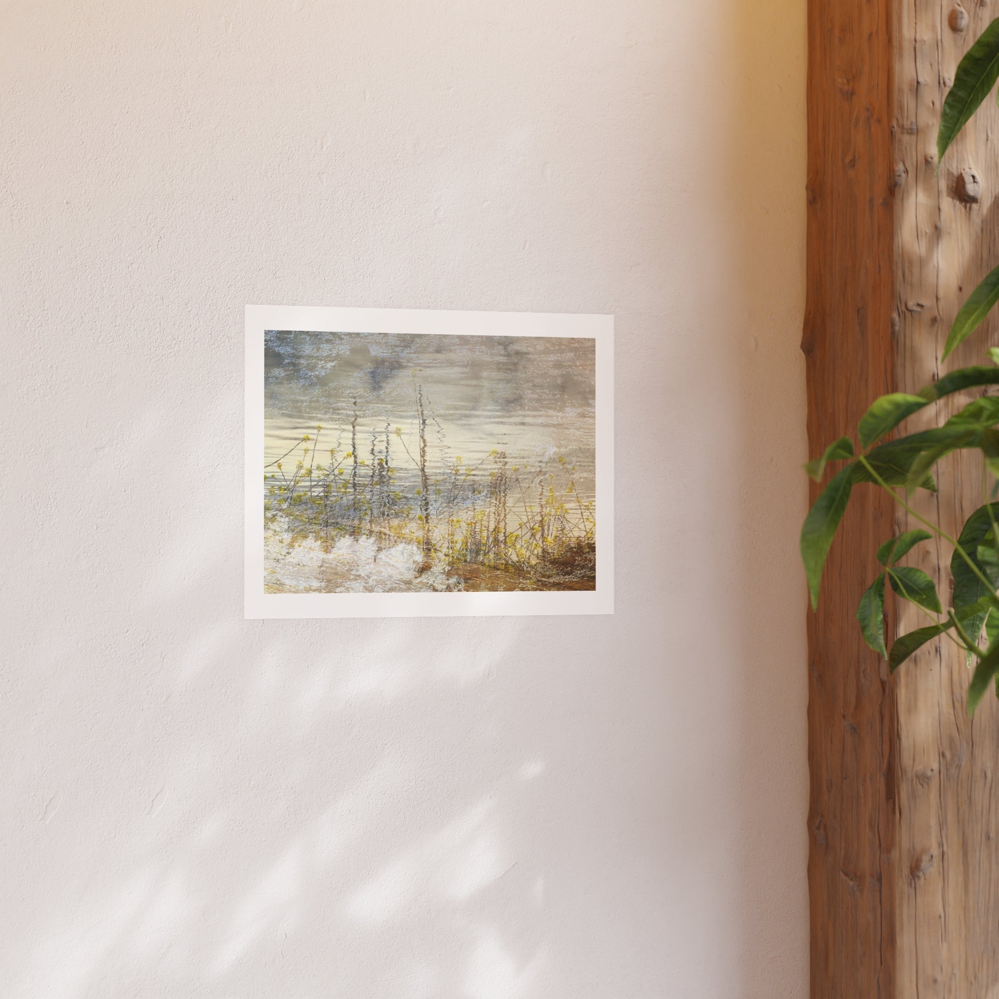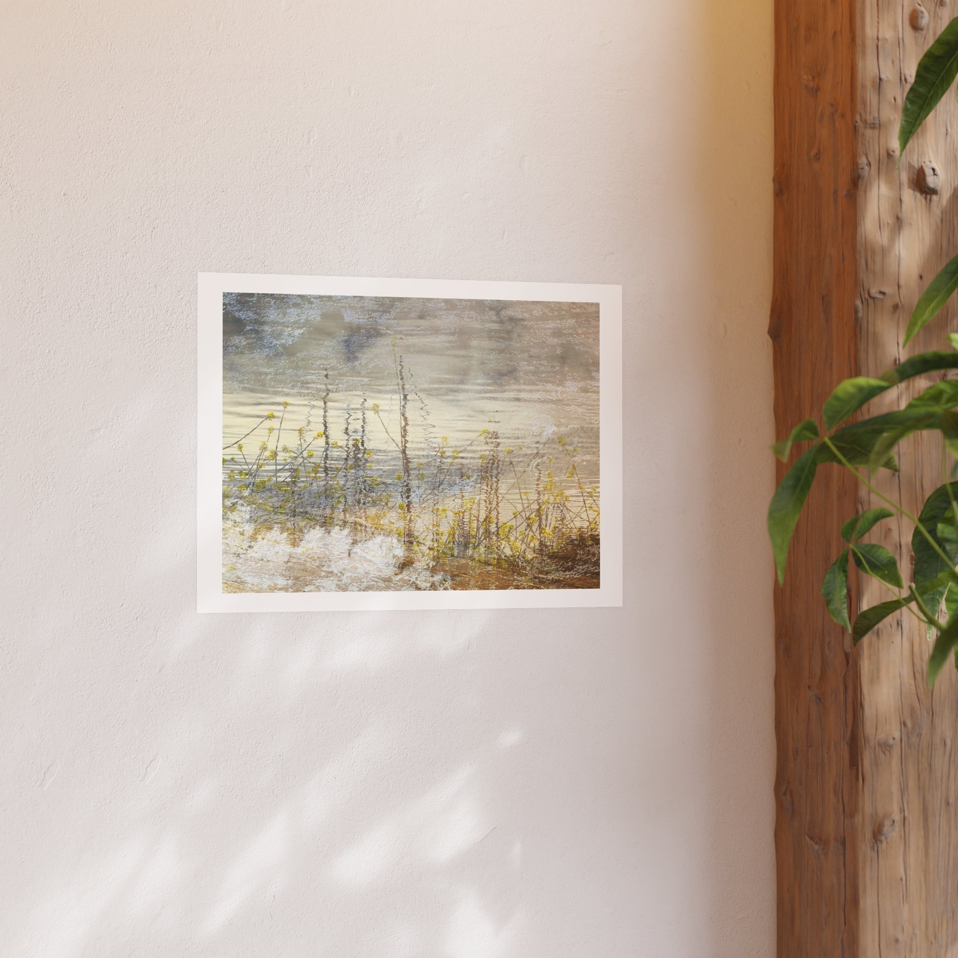 This photographic artwork captures a tranquil reflection of nature’s serene beauty, with ripples on the water creating an ethereal, abstract effect. Inspired by the calming presence of yellow flowers and their delicate interaction with the water’s surface, inviting viewers to find their moments of stillness and serenity within the piece.