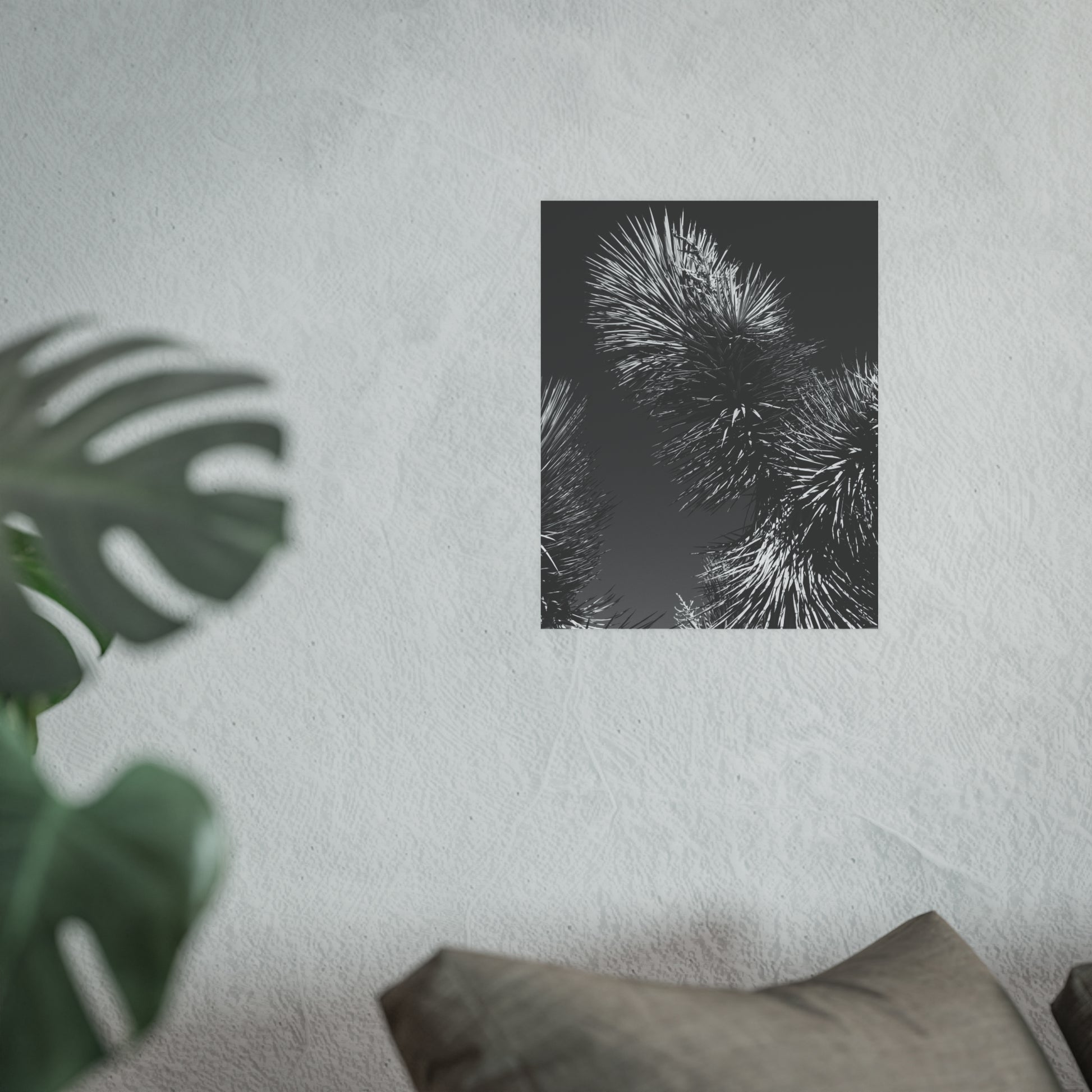 Embrace the commanding presence of this stunning black-and-white photograph featuring a majestic Joshua Tree. By stripping away color, the focus is placed entirely on the texture and form, allowing viewers to appreciate the intricate patterns and natural artistry of this iconic desert plant.