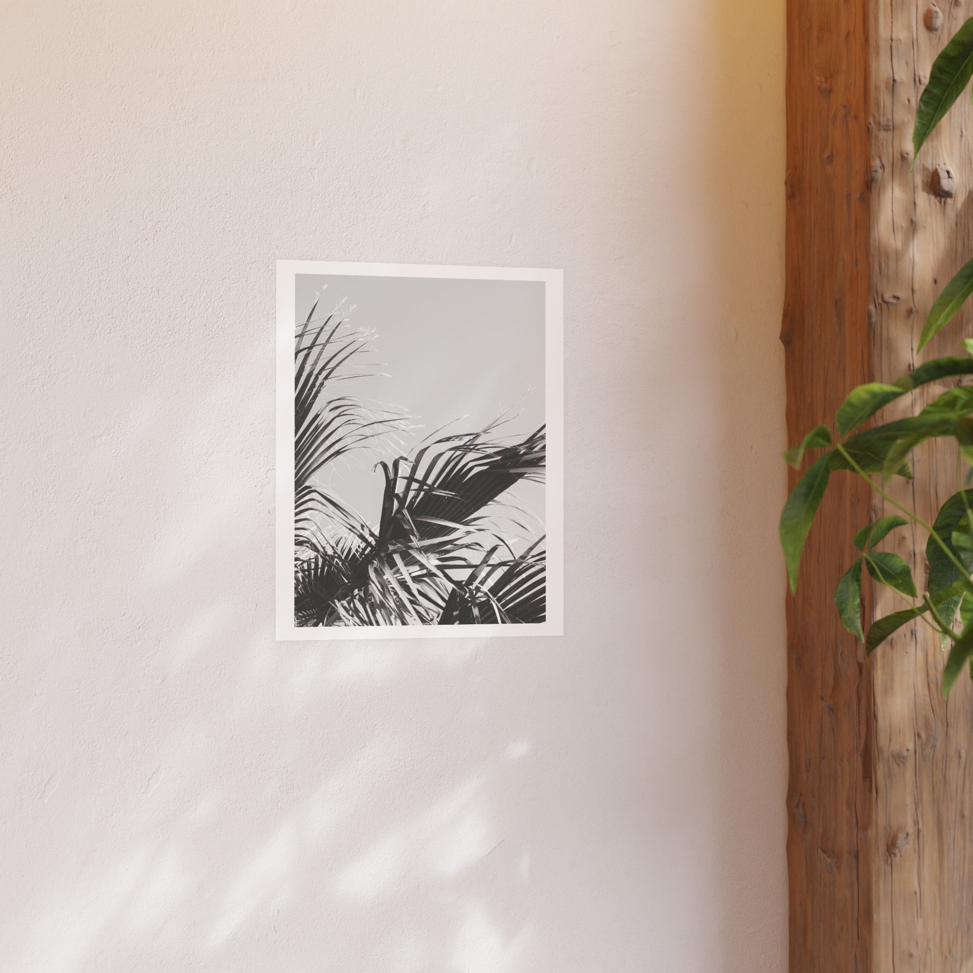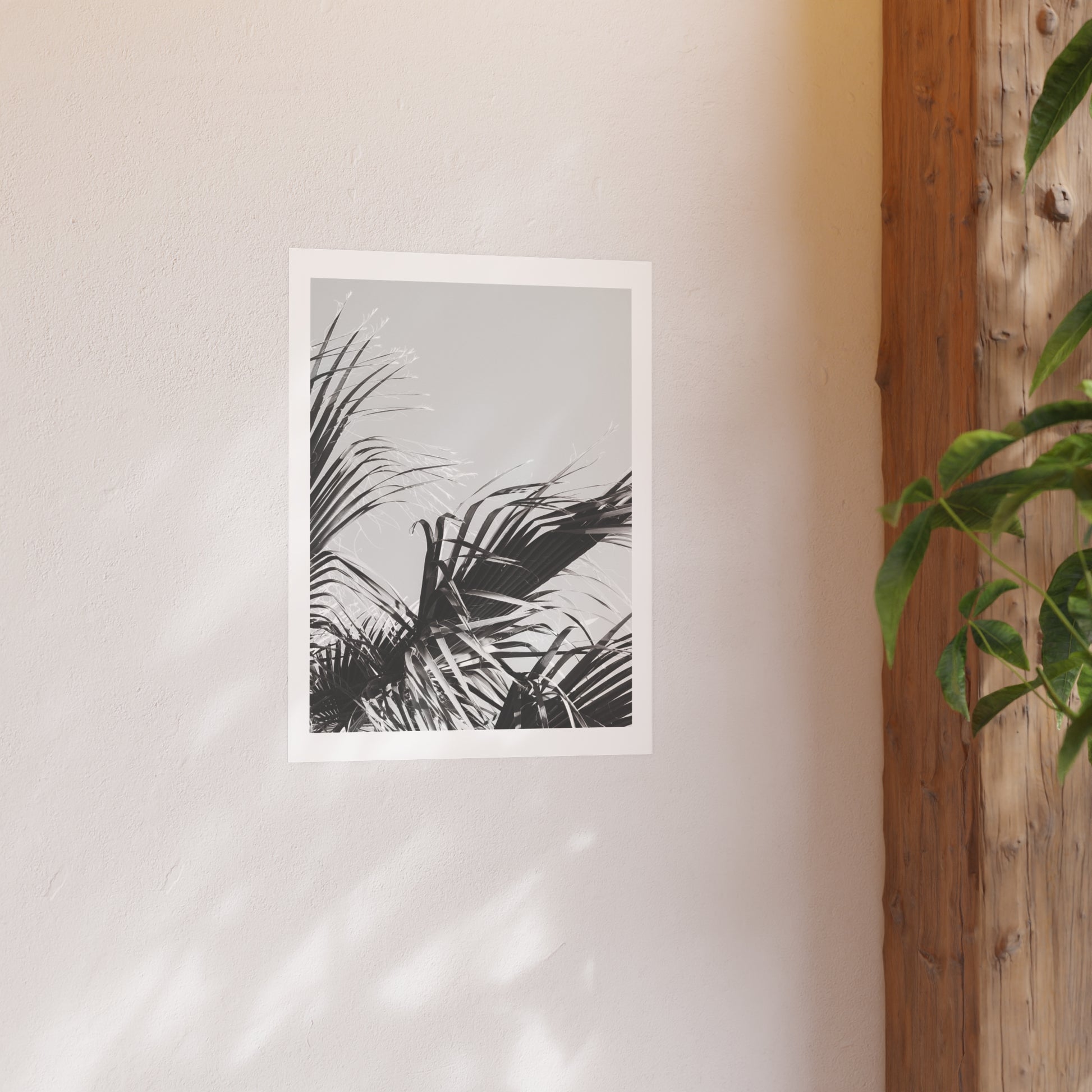 This black-and-white photograph captures the delicate motion of palm leaves dancing in the wind, their intricate shapes etched in sharp contrast against a clear background. The interplay of light and shadow highlights the graceful rhythm of nature, evoking a sense of serenity and timeless beauty. A striking blend of movement and stillness, this piece invites contemplation and connection with the natural world.